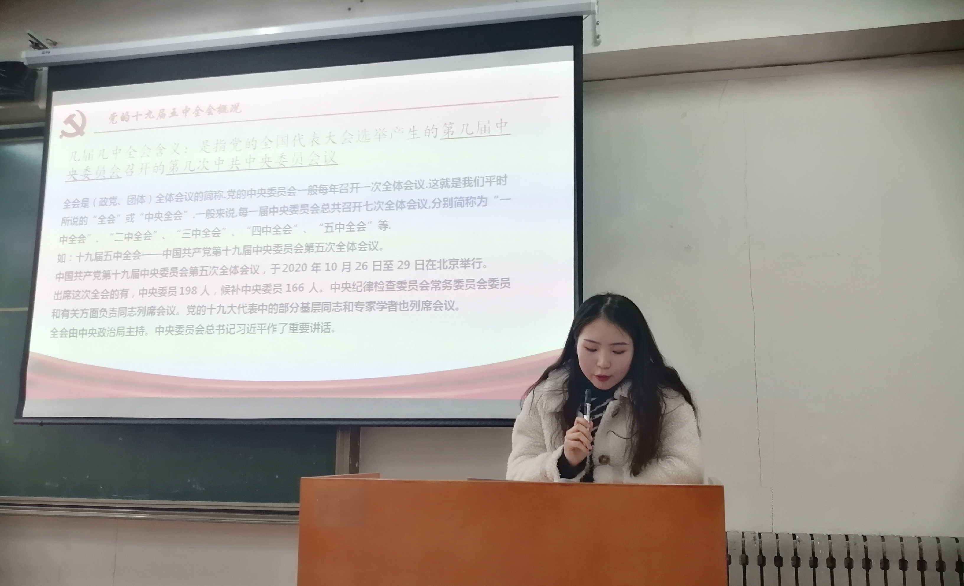 12月17日中午12时30分,长安校区天平楼A107教室,学习贯彻党的十九届五中全会精神员工宣讲团走进公司开展宣讲活动。公司党委副书记张文渊,团总支书记刘佳、李念,2020级辅导员祝越出席宣讲报告会,365英国上市官方网站全体员工党员、班委及员工会部长参加了线下宣讲,其他同学通过“腾讯会议”参加线上宣讲。公司员工宣讲团成员2018级员工张国栋、惠蓓蕾作宣讲报告,团总支书记刘佳主持。