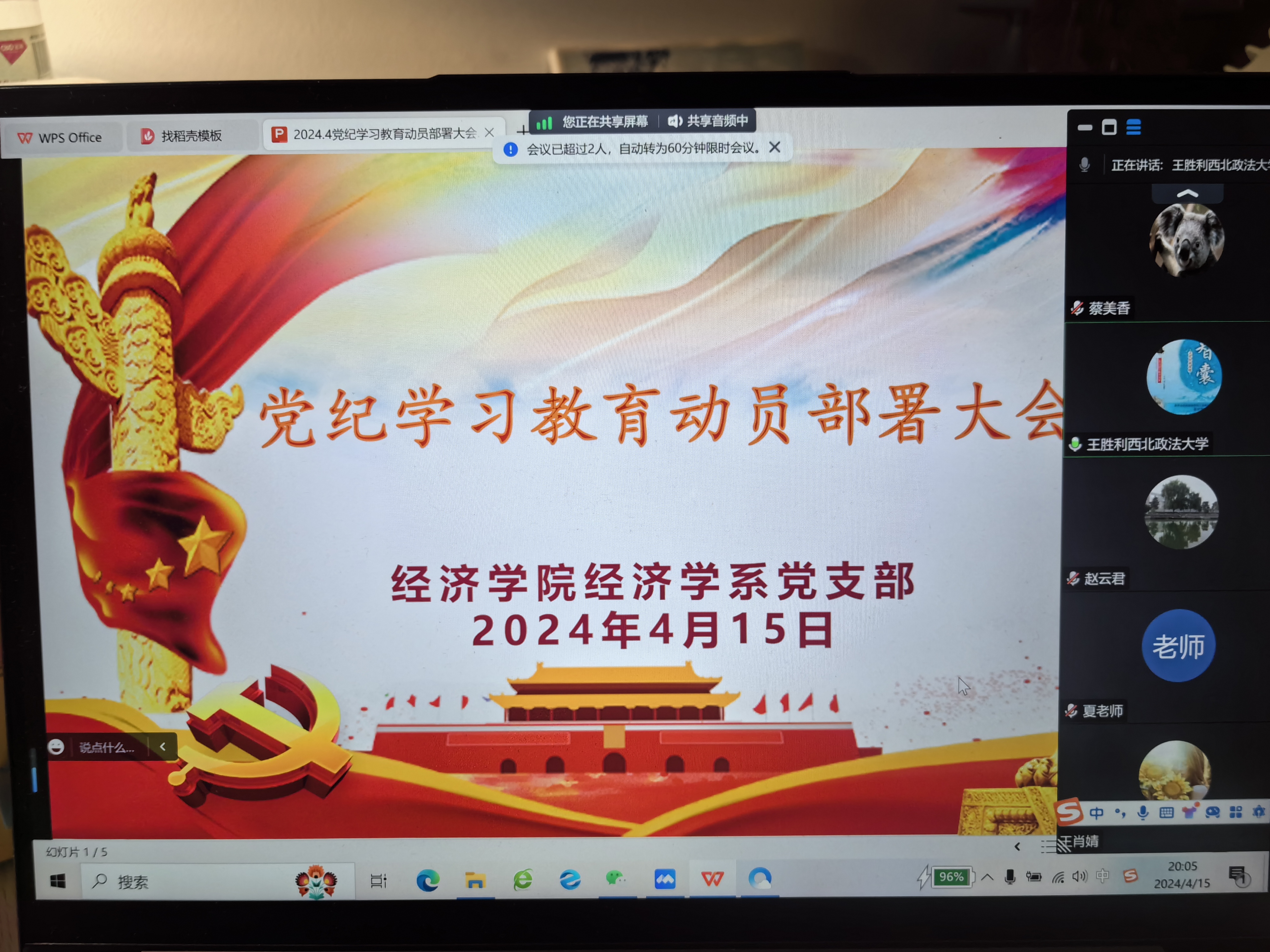 4月15日晚上,365英国上市官方网站经济学系党支部通过腾讯会议召开党纪学习教育动员部署大会,公司经理王胜利、经济学系支部全体党员教师参加学习,会议由支部书记赵倩主持。