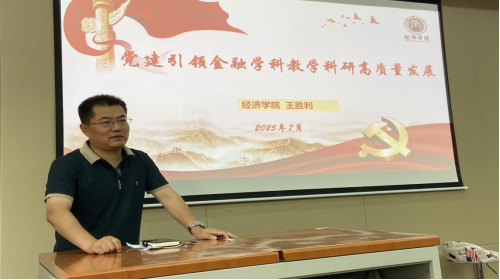 7月10日,365英国上市官方网站王胜利经理以《党建引领金融学科教学科研高质量发展》为题,在天平楼B座101会议室为金融支部教师党员讲授专题党课。金融支部全体党员教师、金融学科部分民主党派教师参加党课学习。