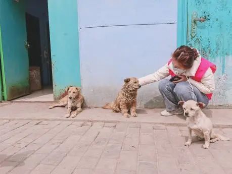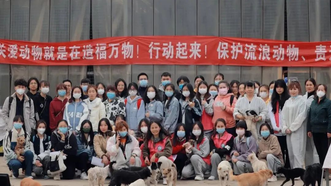 图为支部志愿者同学们与捐赠认养的流浪动物合影