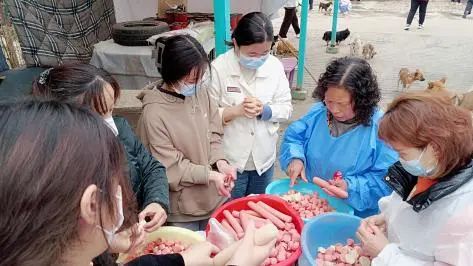 图为各支部志愿者同学们在剥制驱虫药制作流浪动物午餐