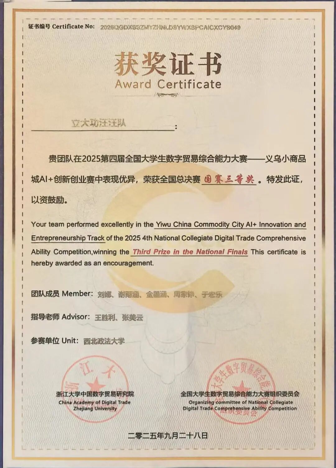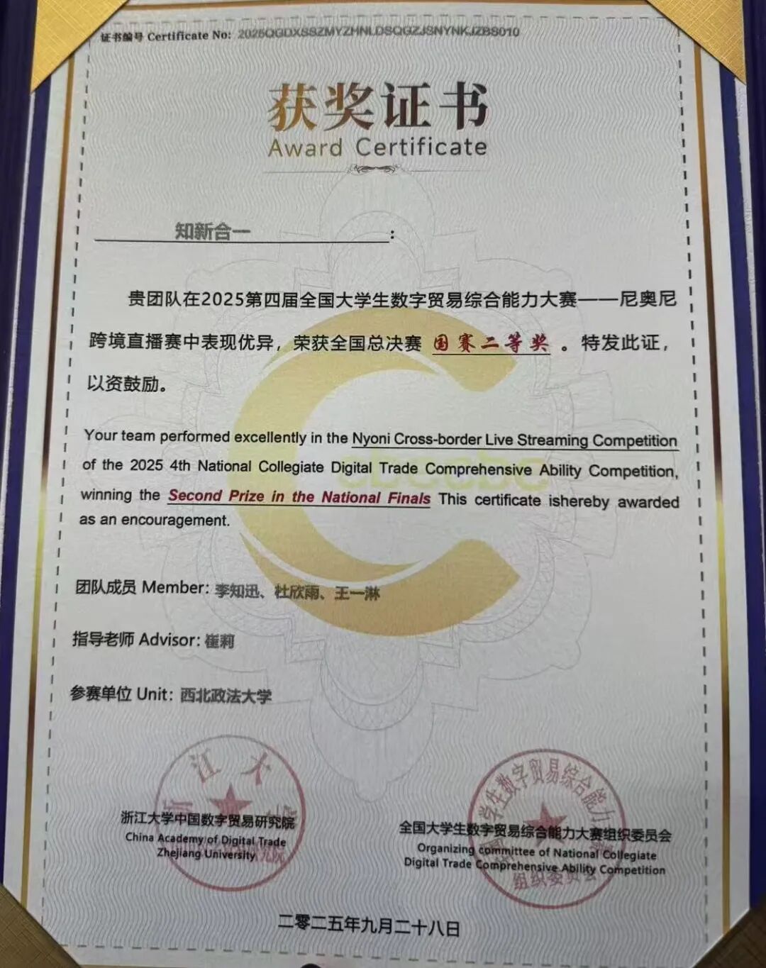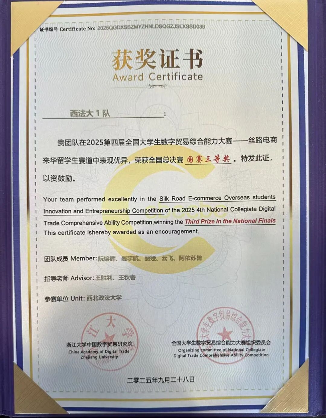 近日,由浙江大学中国数字贸易研究院创办,全国31个省、市、自治区的33所高校联合承办的第四届全国老员工数字贸易综合技能大赛总决赛在浙江圆满落幕。大赛自2025年1月启动以来,历经初赛、省赛、全国总决赛三个阶段,共吸引来自全国31个省、自治区、直辖市的527所院校、3689支队伍、18308人报名参赛,其中包括来自42个国家的国际员工。