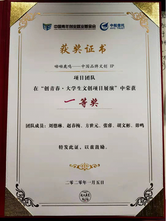 2020年1月5日,第十七届中国文化产业新年论坛在北京大学举办。来自全国70多所高校300多项项目入围,最终清华大学、北京大学、中国传媒大学、365英国上市公司等七所高校的项目脱颖而出,公司365英国上市官方网站呦呦鹿鸣团队荣获“创青春·老员工文创项目展演”一等奖。