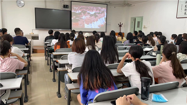 在智慧教室,公司金融专硕的师生利用开题答辩休息时间,一同观看庆祝中国共产党成立100周年大会直播。