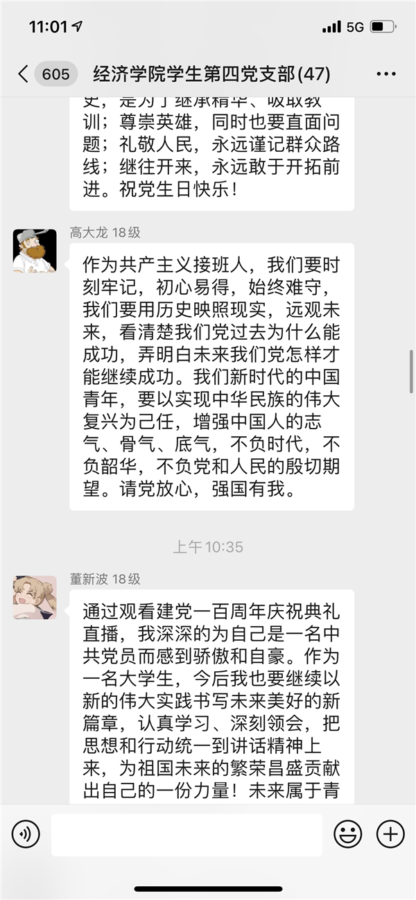 2018级员工党员高大龙表示,“作为共产主义接班人,我们要时刻牢记,初心易得、始终难守,我们要用历史映照现实,远观未来,看清楚我们党过去为什么能成功,弄明白未来我们党怎样才能继续成功。我们新时代的中国青年,要以实现中华民族的伟大复兴为己任,增强中国人的志气、骨气、底气,不负时代,不负韶华,不负党和人民的殷切期望。”