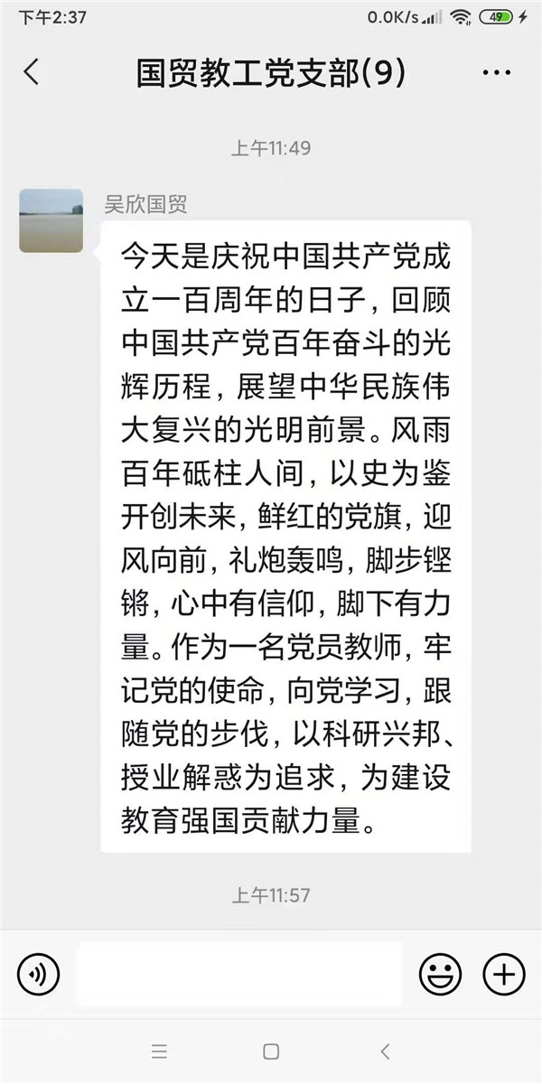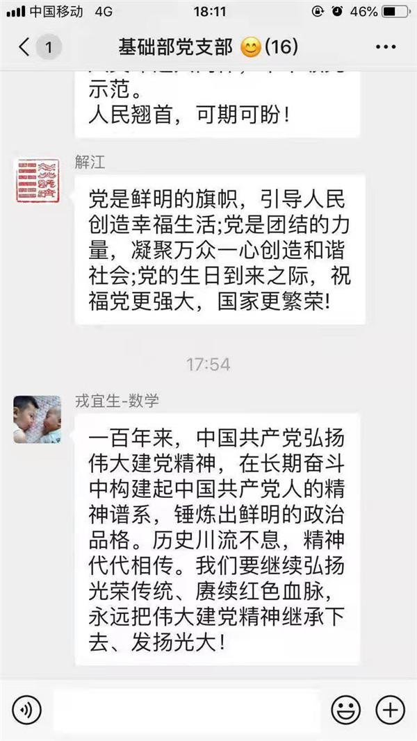 民主党派代表陈小勇老师谈到,今天是中国共产党成立100周年,从中国共产党诞生之日起,就把为中国人民谋幸福、为中华民族谋复兴确立为自己的初心使命。习近平总书记在讲话中一再强调“人民”的核心地位。“百年”、“人民”这两个关键词使我想到了《管子》中的“十年树木,百年树人”这个典故。作为一个教育工作者,我深刻感受到“立德树人”是一个伟大而长期的工作,这也激励我们教育工作者一定要坚持不懈,勇往直前!
