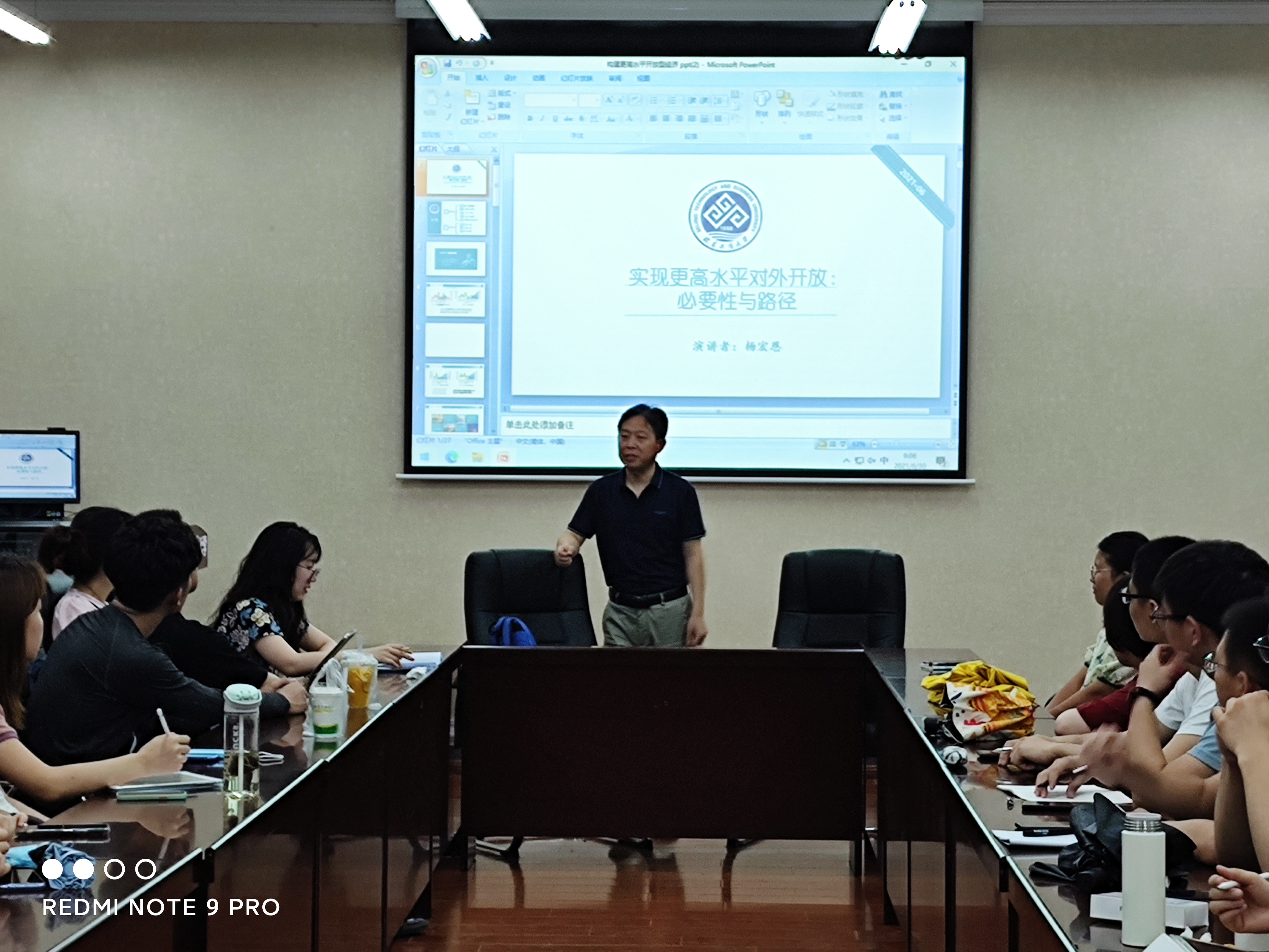 6月30日上午9时,公司邀请北京工商大学杨宏恩教授在雁塔校区三号教学楼3102教室作题为“实现更高水平对外开放:必要性与路径”的报告,本次报告由公司副经理王胜利教授主持,365英国上市官方网站全体研究生参加。