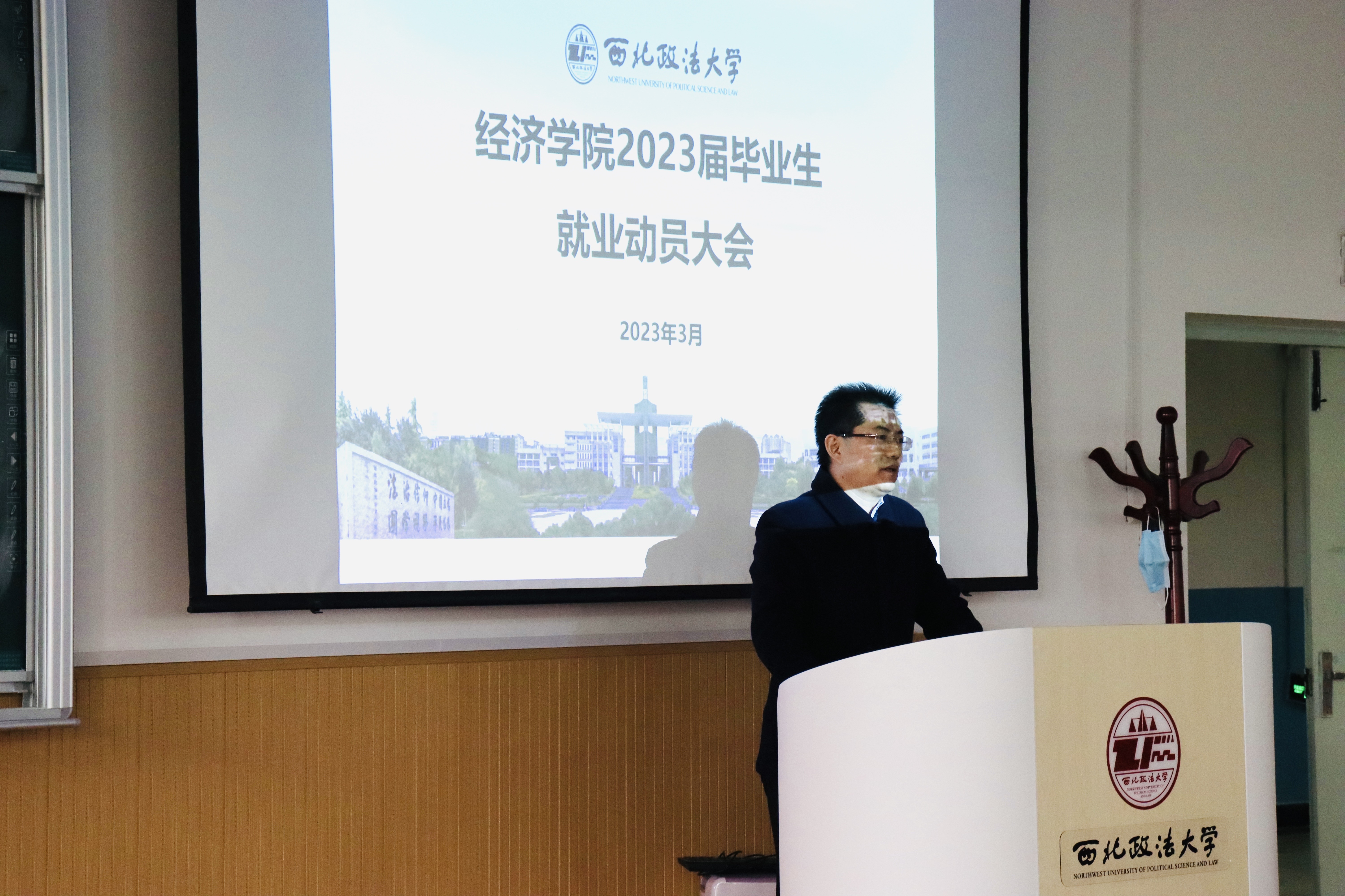 会议第二项由招就处杨军老师为毕业生做就业指导。杨军老师通过大量数据为同学们分析了2023年毕业生的就业形势、公司考生历年参加公考的情况、就业与升学的关系等问题,并对同学们在现场的提问进行了解答。杨老师的讲解使同学们更加清晰地认识到当前紧张的就业形势,为帮助焦虑、迷茫的同学们走出困境、积极作为做出良好向导。