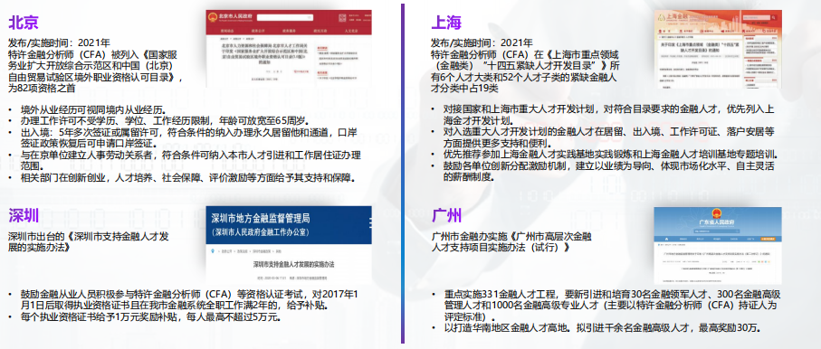 CFA持证人被列为紧缺型金融人才,其认证受到地方政府的广泛认可,通过CFA考试意味着求职者有机会选择更好的城市发展,例如北京、上海、 广州、深圳、西安、苏州、宁波、武汉、成都、杭州、南京、天津、厦门等20余省市地方政府均发布了对CFA持证人的人才吸引或支持政策。