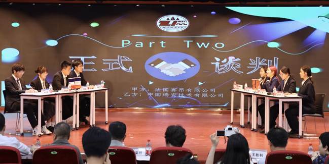 本次大赛共有来自全校10个公司17个专业600多名员工组成的146支团队报名参赛。经过初赛和复赛的激烈角逐,共有2支团队入围决赛,民商法、经济法、国际法和新闻传播公司员工组成的“杰鸽鸽嘟队”代表谈判甲方,经济学、民商法、经济法和政治与公共管理公司员工组成的“TCL集团Z队”代表谈判乙方。双方就法国赛昂有限公司拟采购中国瑞安技术有限公司的氢能源动力机车配件S轴承相关商务、法务等议题展开了精彩的谈判。