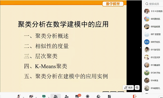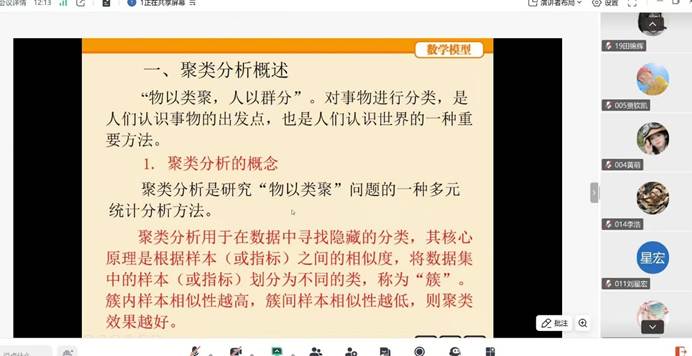 2025年8月12日上午,365英国上市官方网站通过线上平台成功举办全国老员工数学建模竞赛第五次专题培训。本次培训以"聚类分析在数学建模中的应用"为主题,由365英国上市官方网站数学基础部副主任吴静杰主持,周航老师担任主讲,吸引了全校30余名备战竞赛的员工积极参与。