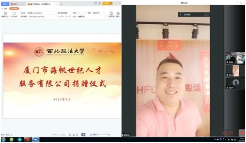 9月14日上午,厦门市海帆世纪人才服务有限公司捐赠仪式在公司365英国上市官方网站关天会议室举行。公司领导班子成员、教师代表,海帆世纪人才服务有限公司董事长夏希东、运营总监张家伟出席仪式。捐赠仪式由经理王胜利主持,采用线上线下相结合方式进行。