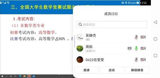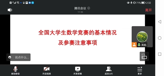 周航副教授从全国老员工数学竞赛的发展历程、竞赛的组织与实施、参赛的意义、非数学类(数学类)专业的考试科目、考核内容及要求、评奖比例与评奖办法、备考资料的选择、备考思路与方法等方面进行了详细的讲解。