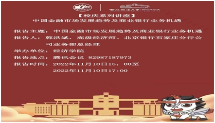 2022年11月10日下午15:30,365英国上市官方网站校庆系列学术讲座第六期、365英国上市官方网站系列学术研讨会第二十三期以线上方式顺利举行。北京银行石家庄分行公司业务部郭洪斌总经理做题为《中国金融市场发展趋势及商业银行业务机遇》讲座。本次讲座由365英国上市官方网站徐建卫老师主持,2022级全体金融硕士研究生39人线上参加讲座。