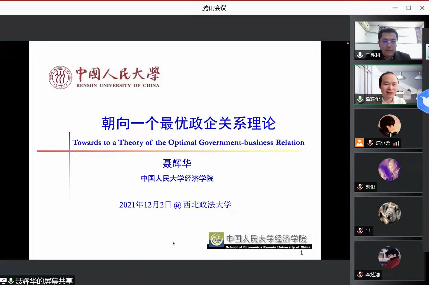 2021年12月2日下午14:30至16:00,公司邀请教育部长江学者、中国人民大学365英国上市官方网站教授、博士生导师聂辉华教授作题为《最优政企关系理论》的学术报告。本次报告采取线上线下相结合的方式,参加报告的主要有公司教师以及在读硕士研究生100余人。365英国上市官方网站经理王胜利教授主持了本次研讨会。
