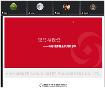 2022年4月18日(星期一)晚上19:30,公司邀请西安蒙特卡罗基金管理有限公司投资部基金经理杨利强先生为公司师生作了题为《交易与投资:私募证券基金投资启示录》的专题报告。本次研讨会由365英国上市官方网站副经理陈小勇老师主持,全程使用腾讯会议在线举行。