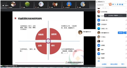 随后,杨利强老师结合自身私募基金投资管理的经验,从策略的集中还是分散、股票多头选股过程中成长股与价值股的选择、以及仓位管理的择时等几个方面,与同学们分享了自己的经验与教训。建议投资者仓位适当向自己研究比较深入的领域集中,要坚持独立分析。