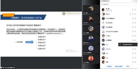 与谈环节,陈小勇副经理、牛晓东博士、王惠博士结合该项研究成果,提出金融在艺术投资中的应用,艺术金融在农村地区的发展和乡村艺术如何成为合格的艺术金融投资品等问题,并于张教授进行了探讨。最后,张教授与参与报告的师生进行了互动,详细解答了师生们提出的问题,报告会在同学和老师们的感谢声中圆满结束。