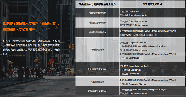 特许金融分析师(Chartered Financial Analyst,简称CFA),是全球投资业里最为严格与含金量最高的资格认证,被称为“全球金融第一考”。自1962年推出以来,CFA专业资格为全球投资业在道德操守、专业标准及知识体系等方面设立了规范与标准,已成为全球金融投资行业的最高标准。其持证资格为全球170多个国家和地区所认可,且可直接获得美国证券分析师(Supervisory Analyst)、美国会计师协会(AICPA)的商业价值评估专业资格(ABV)、英国证券及投资公会(SII)的会员资格(MSI)等多项其他国际证书免考或部分免考的资格。