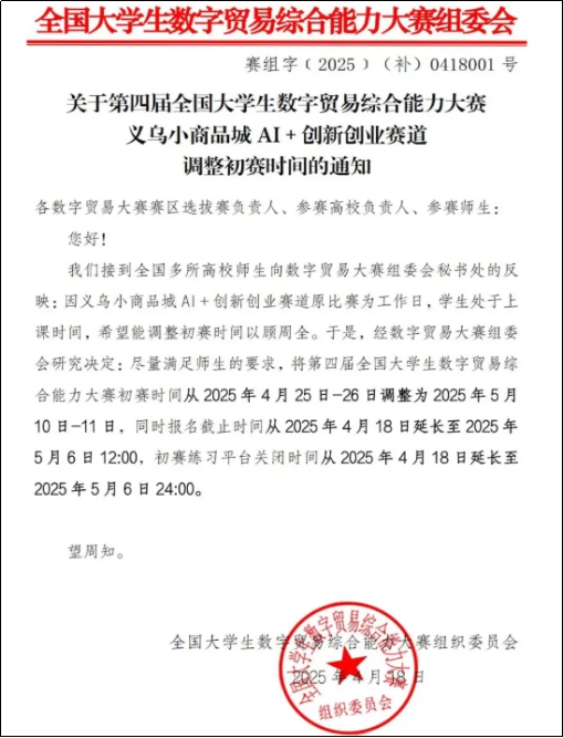 2.赛道二:跨境直播赛道比赛时间从2025年5月9日调整为2025年5月8日(19:30——21:30)。