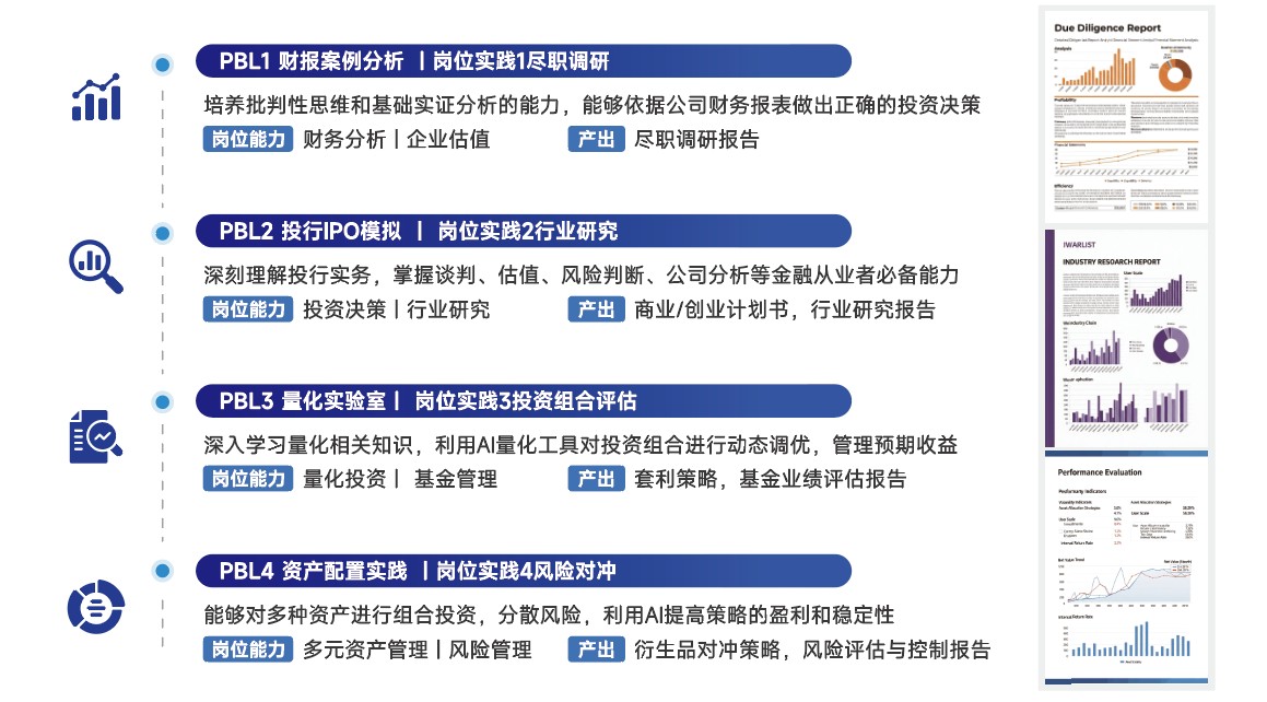 实验班金融导读阶段采用全球知名商公司(哈佛、斯坦福等)广泛使用的PBL项目制式教学方法,在理论知识教学中融合经典商业案例与实战练习。课程体系以 “核心专业力 + 岗位胜任力 + AI 应用力” 三位一体的培养框架为核心,通过三大模块分层递进、协同赋能,构建起理论与实践交融、专业与技术并驱的立体化课程架构,全方位提升学员综合竞争力。
